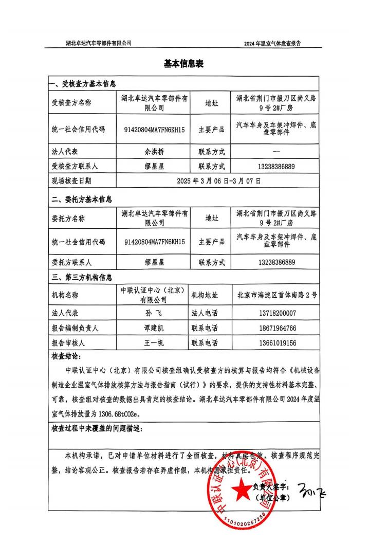 湖北卓達(dá)汽車零部件有限公司溫室氣體排放盤查報(bào)告